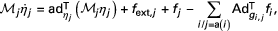 , où chaque copie de G = SE(3) représente le groupe de configuration de chacun de ses corps constitutifs, considéré comme isolé dans la chaîne. Pour établir ce modèle, on peut appliquer les équations de Poincaré au lagrangien réduit de chacun des corps, ou plus simplement, on peut leur appliquer la loi de Newton et le théorème d’Euler du moment cinétique. Puisque les corps sont isolés, ils doivent être mathématiquement réassemblés par le modèle cinématique des articulations et le modèle prend la forme de l’ensemble suivant d’équations algébro-différentielles avec