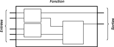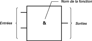 La fonction complète représentée par un programme FBD est construite à l'aide de blocs élémentaires standards de la librairie standard ou de la section des fonctions ou des blocs fonctionnels. Chaque bloc a un nombre défini de points de connexion en entrée et en sortie. Un bloc est représenté par un rectangle simple. Les entrées sont connectées sur le bord gauche du rectangle. Les sorties sont connectées sur le bord droit. Un bloc élémentaire réalise une seule fonction entre ses entrées et ses sorties. Le nom de la fonction réalisée par le bloc est inscrit dans son symbole rectangulaire. Chaque entrée ou sortie du bloc est caractérisée par un type bien défini.