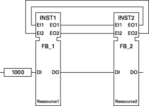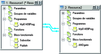 Lors de l'ajout d'une instance de bloc fonctionnel CEI 61499 dans une ressource pour un programme donné, les fenêtres de ressources dans le diagramme des échanges sont automatiquement mises à jour lorsque les changements sont enregistrés et que l'éditeur de langage est fermé.