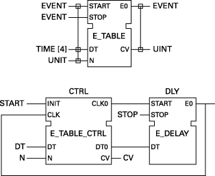 ISaGRAF assure automatiquement la synchronisation entre les entrées de données et les entrées d'événements. La représentation graphique CEI 61499 du bloc fonctionnel E_TABLE ci-après démontre les entrées de données DT et N retenues avec l'entrée d'événements START et la sortie de données CV retenue avec l'entrée d'événements EO. ISaGRAF retient automatiquement l'entrée de données CV avec l'entrée d'événement EO.