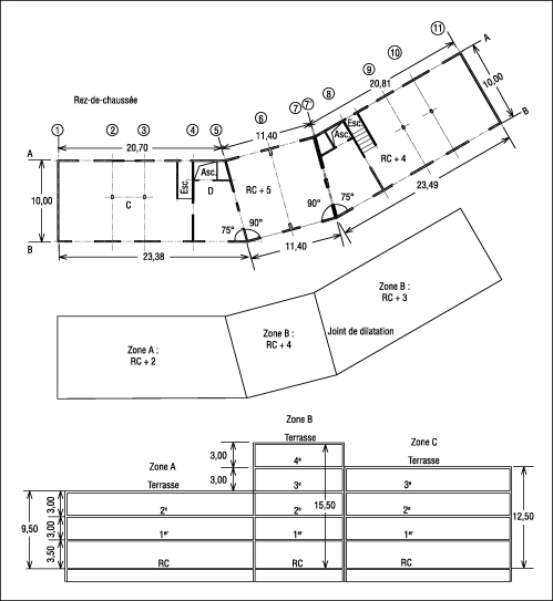 Le bâtiment comporte trois zones distinctes. La zone A comporte deux étages sur rez-de-chaussée, la partie centrale B, quatre niveaux sur rez-de-chaussée, et la dernière C, trois étages ( cf . Fig. 1 ).