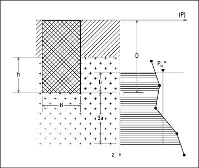 - a = moitié de la largeur B de l’élément de fondation si celle-ci est supérieure à 1 m et à 0,50 m dans le cas contraire ;