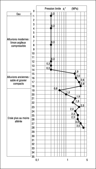 On veut vérifier, suivant le fascicule 62 titre V, qu’un pieu foré boue de 800 mm de diamètre et 22 m de long ancré dans le terrain dont le sondage pressiométrique est joint à la figure 1 peut supporter les charges qui lui sont appliquées. On justifiera le pieux vis-à-vis des combinaisons fondamentales aux ELU, quasi permanentes et rares aux ELS.