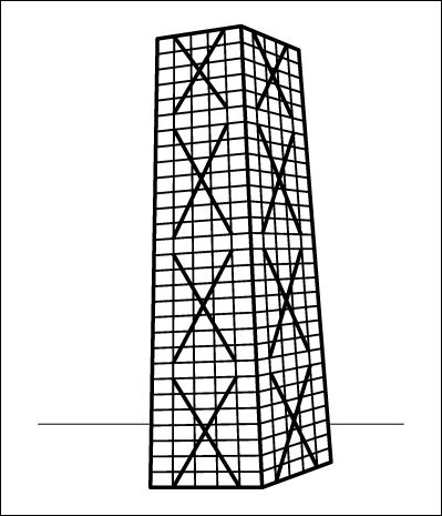 Toutefois, la solution dans laquelle la reprise des actions horizontales est effectuée dans les faces extérieures semble avantageuse. La figure 1 présente une solution de type « derrick » où les contreventements de façade sont des ossatures triangulées, mais une ossature de façade en portiques conviendrait également.