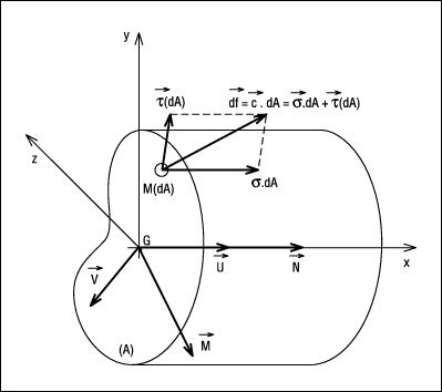 Si (A) est une section droite perpendiculaire à l’axe de la pièce, les systèmes ont les mêmes éléments de réduction en G, centre de gravité de la section ( cf . Fig. 1 ).