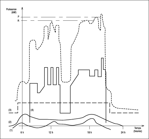 Un bâtiment à usage industriel ou commercial, une usine ou un centre hospitalier sont les cas les plus complexes. La seule méthode d’évaluation des puissances réelles est d’établir le diagramme de fonctionnement des récepteurs gros consommateurs d’énergie, en fonction du temps (cf . Fig. 1 ). La courbe de puissance totale à prendre en compte est la somme des courbes élémentaires des récepteurs considérés. Les différentes courbes de puissance sont numérotées :