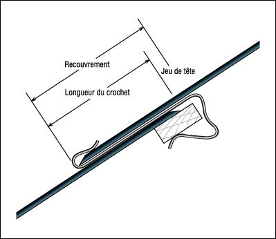 La longueur du crochet est égale à la valeur du recouvrement arrondie au centimètre supérieur ( cf . Fig. 2 ) ; elle varie de 7 à 16 cm. Le jeu en tête d’ardoise permet de voir les traits de liaison et facilite les réparations.