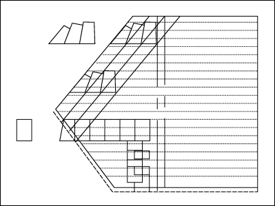 Afin de ne pas avoir de liaison oblique qui recouvre une liaison droite (et générer une fuite), l’arêtier doit être prolongé jusque dans la rive. Pour déterminer à quel moment commence l’arêtier, le couvreur trace une parallèle à la ligne d’inclinaison qui passera par l’angle droit de la base des contre-approches. Cette ligne est prolongée jusqu’à la rive biaise. Elle permet de déterminer l’emplacement de la première contre-approche ( cf . Fig. 2 ).Croupe alsacienne