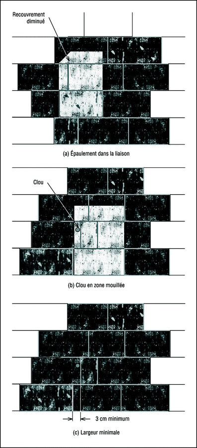 Dans le cas d’une couverture au clou, toutes les ardoises de remplissage sont fixées à un clou de tête. Du fait du décalage des liaisons, le clou peut se trouver dans la zone mouillée de l’ardoise, voire dans la liaison ( cf . Fig. 1b ).