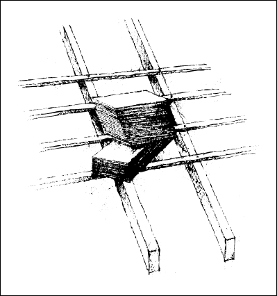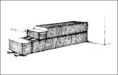 L’ardoise est stockée directement sur le versant : une poignée d’ardoises est d’abord coincée horizontalement entre deux liteaux sans nœud, le long d’un chevron, et le restant est ensuite empilé dans le prolongement de celui-ci ( cf . Fig. 2 ).B - Levage manuel