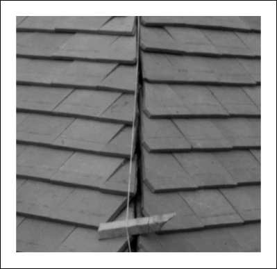 Les arêtiers en saillie : traités un peu comme un faîtage en pente. Les tuiles des deux versants sont d’abord taillées en approche de la ligne d’arêtier ( cf. Fig. 1 ).