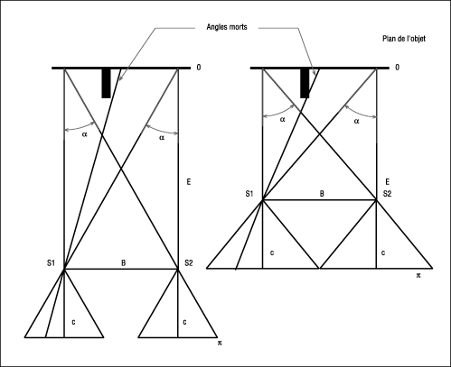 ) entre la distance séparant les deux chambres S1 et S2, appelée « la base » (B), et la distance principale (E) séparant le plan objet (0) de l’objectif (S1). En effet, la précision est meilleure si les rayons perspectifs homologues, c’est-à-dire joignant un même point de l’objet, se coupent entre 60 et 90 degrés. En fait, il faut que le rapport