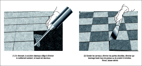 - si, par sondages multiples, on a pu vérifier que ces anciens carrelages adhéraient parfaitement, on pourra les laisser en place, ce qui évitera une démolition difficile ( cf. Fig. 1 ).