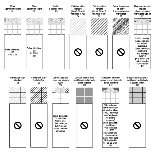 - Tous les supports à base de plâtre sont interdits sauf les plaques de plâtre cartonnées hydrofugées qui doivent cependant être protégées par un SPEC et les carreaux de plâtre « super hydrofugés ».