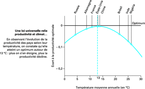 Selon une étude publiée en 2016 par l’Université de Stanford aux États-Unis , les données historiques suggèrent, qu’au niveau mondial, un pays atteint le maximum de sa productivité avec une température moyenne de 13 °C (voir l’évolution de la production par rapport à la température moyenne sur la figure ci-après).