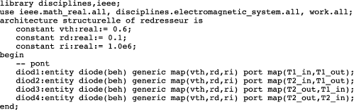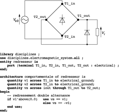 L’exemple choisi est simpliste avec des composants réduits à leur plus simple expression. Pour illustrer VHDL-AMS, nous allons modéliser un redresseur double alternance sous sa forme comportementale, puis, de façon structurelle, à partir des diodes parfaites (encadré 34). Le réseau est parfait et la charge est inductive avec une diode de roue libre. Même avec cette simplicité extrême nous obtenons déjà des allures de courant dans les semi-conducteurs et dans la charge, notamment en transitoire.