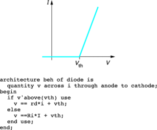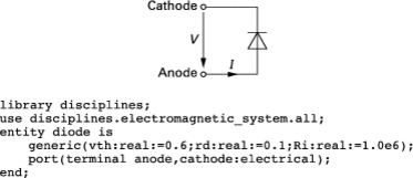Le modèle suivant (encadré 35 ) commence par définir la bibliothèque de disciplines puis l’interface du modèle de diode. Elle est générique sur sa tension de seuil et sa résistance à l’état passant. Les interconnexions sont deux terminaux électriques (sur ces terminaux, les lois de Kirchhoff seront implicitement respectées).