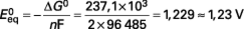 Dans l’état standard (T = 25 °C, p = 105 Pa = 1 bar, eau liquide) W e = – ΔG 0 = 237,1 kJ/mole H2, ce qui correspond (avec n = 2 pour l’hydrogène) à une f.é.m. à l’équilibre (courant nul) :