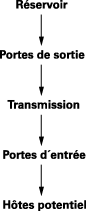 Une chaîne de transmission est constituée de cinq maillons : le réservoir d’agents biologiques, les portes de sortie, la transmission, les portes d’entrée dans l’organisme et l’hôte potentiel :