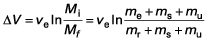 Notons m e la masse d’ergols totale du dernier étage, m s sa masse sèche, m r la masse de réserve, m u la masse de charge utile et v e la vitesse d’éjection. Les masses initiale et finale sont M i et M f et l’impulsion délivrée par l’étage est :