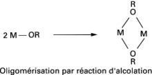 La possibilité de coordinence supplémentaire propre à certains alcoxydes se traduit par leur tendance à s’associer sous forme d’oligomères via des ponts alcoxy par un mécanisme d’addition nucléophile :