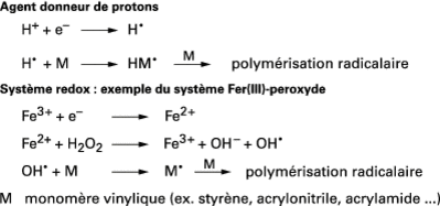 Le schéma suivant donne deux exemples d’amorçage à la cathode de polymérisation d’un monomère vinylique (styrène, acrylonitrile, acrylamide, etc.) dans le cas d’une électropolymérisation indirecte.
