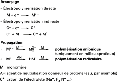 la polymérisation électrochimique. Apparue dans les années 1950, cette méthode consiste en la polymérisation amorcée à l’électrode d’un monomère en solution. Les monomères sont, dans ce cas, des composés portant des fonctions susceptibles de s’oxyder ou de se réduire directement à l’électrode (électropolymérisation directe) ou par l’intermédiaire d’une espèce électro-initiée (électropolymérisation indirecte).