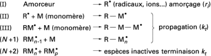 La polymérisation est un processus en chaîne qui fait intervenir une étape d’amorçage, une étape de propagation et une étape de terminaison :