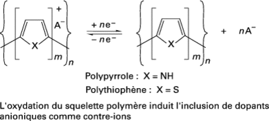 C’est le cas des polypyrroles et des polythiophènes dont la réaction rédox réversible correspondant au dopage-dédopage est donnée ci-dessous.