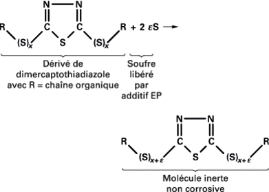 en piégeant sous forme de combinaisons chimiques stables le soufre libéré à température modérée par les additifs EP soufrés (effet « scavenger » : éboueur). Les dérivés du dimercaptothiadiazole utilisés dans les lubrifiants extrême-pression remplissent parfaitement ce rôle à des teneurs comprises entre 0,1 et 0,5 % :