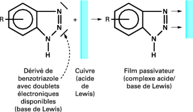 en formant un film protecteur sur les surfaces par suite d’une réaction de chimie de coordination conduisant à la formation de complexes métalliques de coordination, c’est l’effet « passivateur ». Les dérivés du benzotriazole (ou tolyltriazoles), du mercaptobenzi-midazole et du mercaptobenzothiazole sont aptes à passiver les métaux cuivreux selon le schéma réactionnel suivant, dans le cas d’un dérivé du benzotriazole :