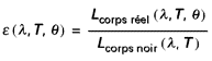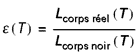 Par définition, on appelle émissivité (en anglais emissivity ) le rapport entre l’émission du corps réel et celle du corps idéal, appelé corps noir, porté à la même température T :