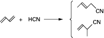 Dans la première étape, une première molécule d’acide cyanhydrique s’additionne sans difficulté sur le buta-1,3-diène pour former un mélange de pent-3-ène nitrile (produit d’addition 1,4) et de 2-méthylbut-3-ène nitrile :
