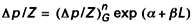 Lorsque le garnissage est arrosé, la perte de pression linéique du gaz peut s’exprimer en fonction du résultat précédent [2] et de la vitesse massique du liquide L par la formule :