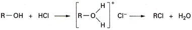 La réaction des alcools avec HCl conduit aux chlorures d’alkyle correspondants par l’intermédiaire des chlorures d’oxonium :