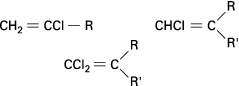 Les oléfines halogénées sont beaucoup moins réactives et réagissent d’autant moins bien qu’elles contiennent plus d’atomes d’halogène. Les dérivés dichlorés et surtout monochlorés de formule :