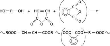 La préparation la plus classique des polyesters insaturés consiste à polycondenser un mélange de diols et d’anhydrides renfermant presque toujours de l’anhydride maléique et, pour certains grades, de l’anhydride phtalique. La réaction principale est la suivante [14] :