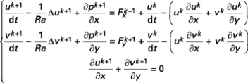De façon préalable on commence par exposer la méthode de pénalisation pour l’équation de Stokes. En effet pour résoudre l’équation de Navier-Stokes, on utilise un schéma temporel de type semi-implicite où à chaque pas de temps on résout un problème de Stokes en prenant pour le terme convectif sa valeur à l’instant précédent. Ainsi connaissant uk, vk et pk on détermine uk+1, vk+1 et pk+1 en résolvant pour k = 0, 1, … le problème suivant :