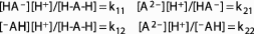Les constantes k 11 , k 21 , k 12 , k 22 sont appelées constantes microscopiques d'acidité ou microconstantes d'acidité. Elles sont définies comme toutes les constantes de dissociation acide par les expressions :
