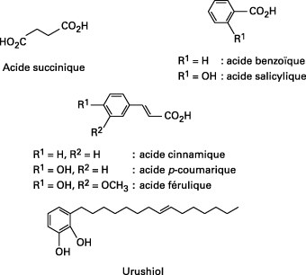 Dans les résines naturelles, on trouve de nombreux constituants acides : des acides aliphatiques (acide succinique de l’ambre jaune), des acides aromatiques (acide benzoïque et acide cinnamique dans la plupart des baumes...) et des acides-phénols (acide salicylique de la gomme ammoniaque, acide p-coumarique des accroïdes, acide férulique de l’ase fétide...), combinés sous forme d’esters aux alcools résiniques (résinols et résinotannols), ainsi que des composés phénoliques (comme l’urushiol de la laque du Japon) de compositions chimiques :