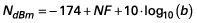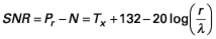 Dans le cas de référence UNB décrit ci-dessus où b = 100 Hz, le plancher de bruit est donc de − 154 + NF dBm. Par conséquent, dans des conditions d’espace libre et en supposant que les gains d’antenne équilibrent approximativement la perte du facteur de bruit, le rapport signal/bruit est de :