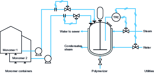 We consider a stirred polymerizer, equipped with a double jacket and an internal coil allowing it to be heated with 5-bar steam or cooled with water, as shown in the diagram at . The plant is classified SEVESO II.