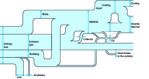 A significant proportion of the power released by combustion of the fuel mixture is lost through heat exchange between the gas and the engine walls, and ends up in the coolant (water power). This proportion varies according to the engine's operating point and thermal state. These exchanges are of the convective and radiative type, and take place in different parts of the engine. Firstly, within the combustion chamber, between the combustion gases and the liner, cylinder head and piston walls, but also within the cylinder head with the intake and exhaust gases.