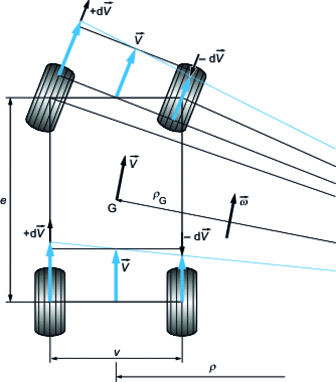 Let's consider a car with all wheels free in a right-hand bend of radius ρ, radius taken from the center of the rear axle; the track, identical at the front and rear, is v, the wheelbase e (figure 1 ).