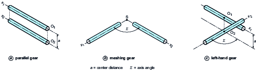 Left-hand gear: the two axes occupy any relative position; they are neither parallel nor intersecting (figure 1 c).