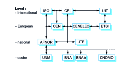 The structure of the standards system is shown in figure 4 . The double arrows show the cooperation and coordination between the different levels: international, European, national and sectoral.