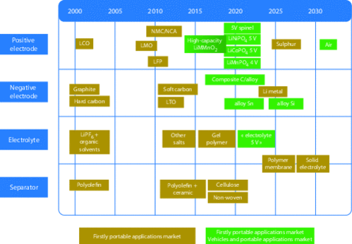 Ongoing developments in the field of lithium batteries aim to enable a further increase in stored energy density, improved safety and lower costs, with the electric vehicle market as the preferred market. The main changes envisaged are summarised in figure 1 .