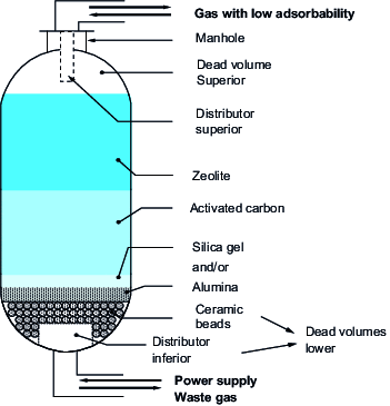 An adsorber is an adsorbent storage element used for purification by an adsorption process. This adsorber is generally axial, but can also be radial in the case of large adsorbent unit volumes and/or when you wish to minimize the pressure drop across the adsorption beds.