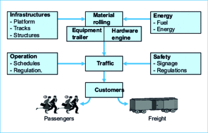 All means of transport are made up of different vectors, so the system approach applies and enables its study by integrating all interfaces. We can thus distinguish seven fundamental vectors of the railway system, shown in figure 1 .