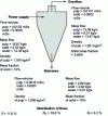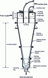 Sedimentation allows for the separation of particles above 100 micrometers. However, the separation of fine particles below this size must be performed by centrifugal force. Hydrocyclones are static devices of a cylindro-conical or cylindrical shape, in which the mineral pulp is injected tangentially under pressure. The elements of the pulp thus undergo centrifugation. Coarse particles move towards the wall of the cyclone whereas fine particles remain in the central zone of the device. Fine particle size cuts are generally comprised between several hundreds and several tens of microns.